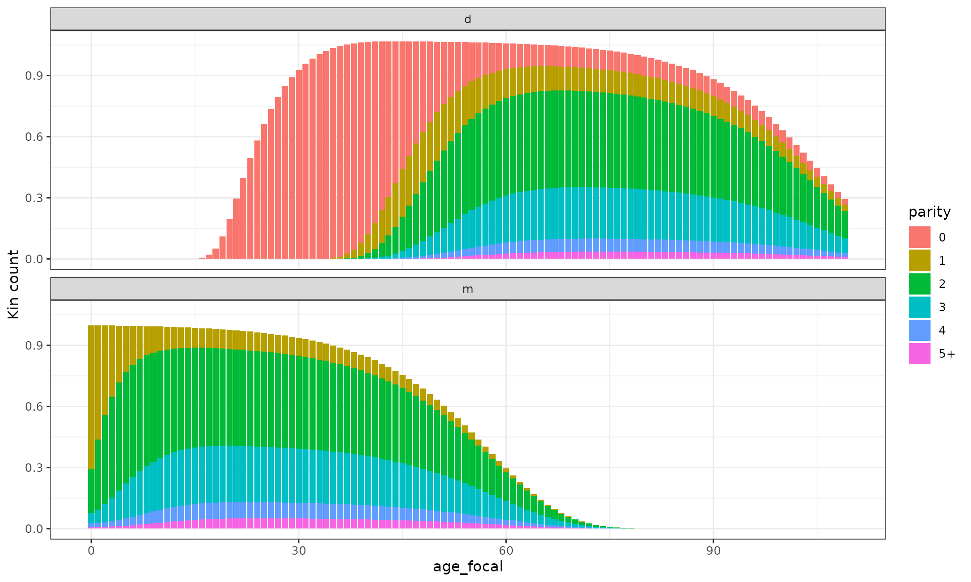 We can also see the portion of living daughters and mothers at different parity stages over Focal’s life-course (this is equivalent to Figure 9 and 10 in Caswell (2021)).