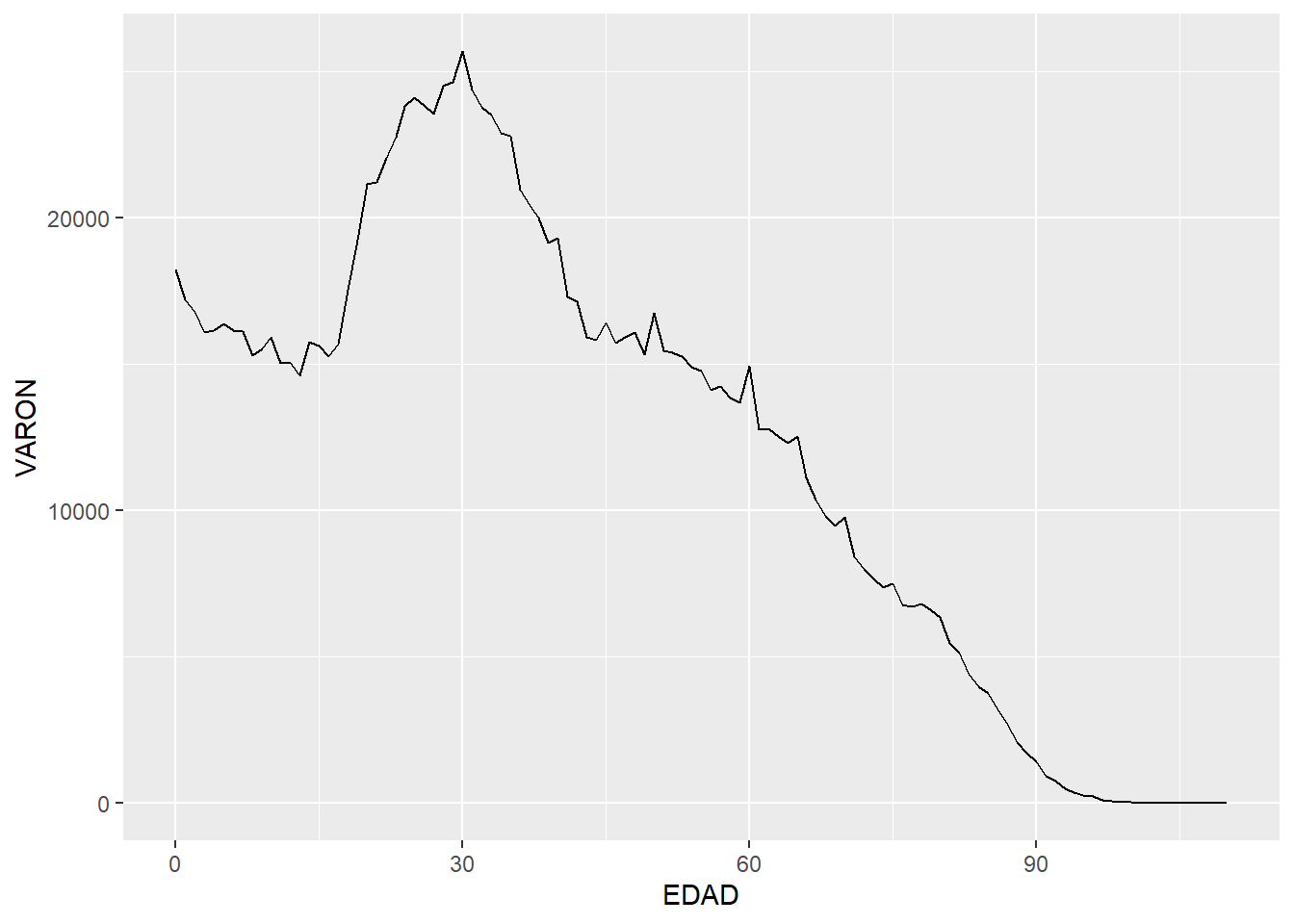Para continuar nuestro camino hacia la pirámide de población con ggplot, conviene que Sexo sea una única variable con dos categorías (una variable de tipo factor). Una buena idea: siempre tratar con tidy data!