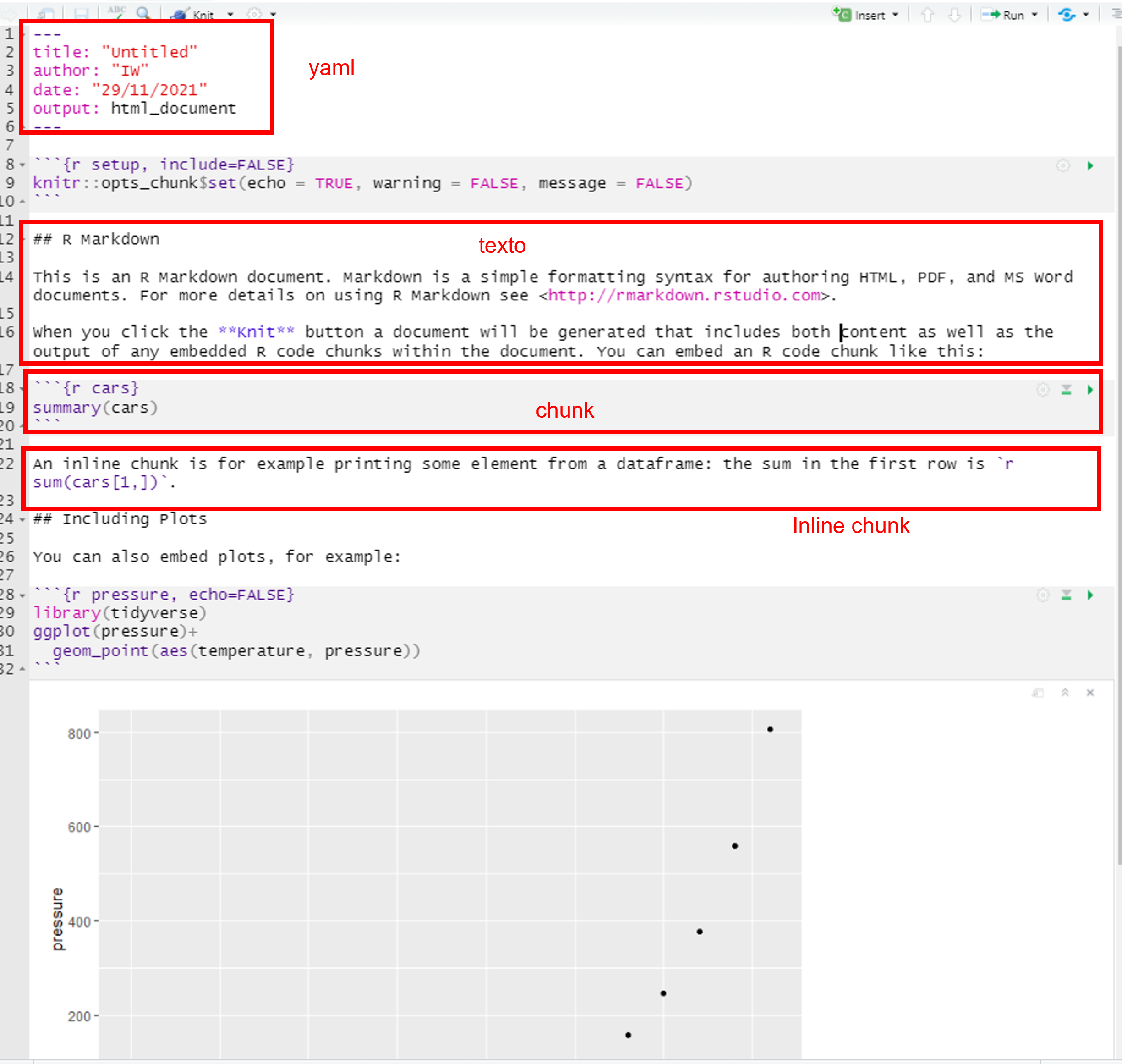 ¡CÓDIGO!, lo que se va generando en la sesión del documento. Los insertas mediante el botón en el menú o combinando las teclas Ctrl + Alt + I. Se activa comenzando con{r} y se finaliza con. Como atributos principales de los chunks se encuentran:rseñalando el lenguaje (se puede nombrar el chunk tambien),eval(¿corro el chunk cuando hagoknit?),echo(¿Muestro el código?),